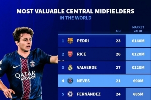 中场中路球员身价榜:佩德里1.4亿欧居首,赖斯、巴尔韦德1.2亿欧