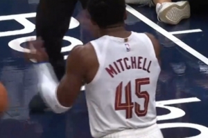 高难度!米切尔冲击篮筐拉杆打中 随后给裁判鼓掌被吹技犯