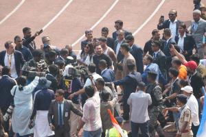 随后,局势逐渐失控,更多官员及其家属围住了梅西。人数太多,以至于从看台上根本看不到梅西的身影。