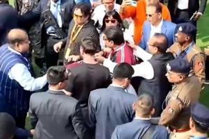 据现场视频显示,不断有印度官员试图与梅西合影,现场秩序一片混乱,主办方、印度企业家杜塔(戴墨镜的那位,后续被印度警方拘留)勉强维持秩序,梅西只能保持礼貌微笑。