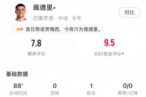 佩德里数据:1助攻,2关键传球,4长传+准确率100%,评分7.8