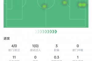 马丁内利本场数据:4次射门0射正,错失1次机会,获评6.5分