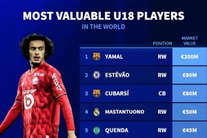 U18球员身价榜:亚马尔2亿欧居首,埃斯特旺、库巴西8000万欧