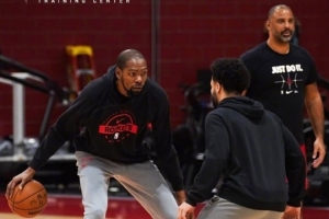 将开启6连客&战掘湖船 火箭官方晒训练照:杜兰特专注 申京微笑
