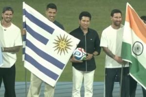 梅西 苏牙 德保罗在活动现场持印度 乌拉圭 阿根廷国旗与嘉宾合影