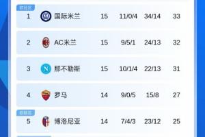 意甲积分榜:国米3连胜登顶!国米33分米兰32分那不勒斯31分