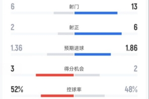 阿拉维斯1-2皇马全场数据:射门6-13,射正2-6,控球率52%-48%