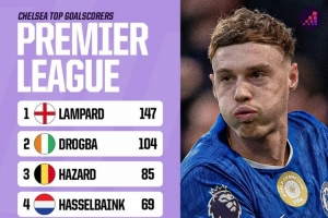 切尔西队史英超射手榜:兰帕德147球居首,帕尔默39球第9
