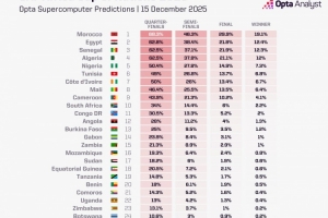 Opta预测非洲杯夺冠概率:摩洛哥19.1%居首,埃及、塞内加尔前三