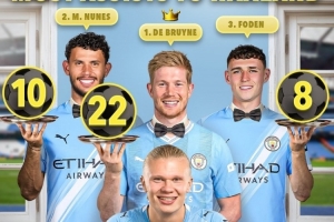 曼城助攻哈兰德次数排名:德布劳内22助居首,努内斯、福登前三