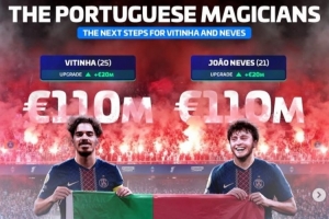 葡萄牙中场双核!25岁维蒂尼亚、21岁若昂·内维斯均达1.1亿欧