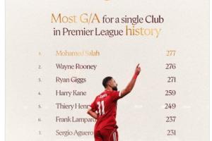 何意?萨拉赫社媒晒英超历史单一俱乐部参与进球榜:法老277球第1