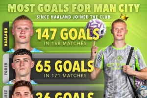 哈兰德加盟曼城后进球榜:本人147球绝对领跑,福登65球位列次席