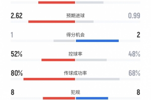曼联2-1伯恩茅斯半场数据:射门17比7,预期进球2.62比0.99