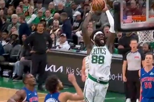 吐舌头提前庆祝!科塔持球突破 垫步起飞双手滑翔暴扣!