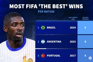 体育资讯12月17日讯 FIFA年度颁奖典礼结束,登贝莱获FIFA年度最佳球员,德转列各国球员获FIFA年度最佳球员次数,巴西9次最多,阿根廷8次第二,葡萄牙6次第三。