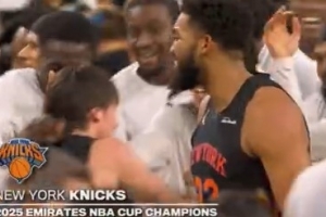 夺冠领奖金咯!尼克斯球员场内疯狂庆祝&戴上冠军帽