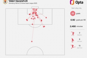 卡扎伊什维利本赛季运动战进25球,刷新单赛季中超运动战进球纪录