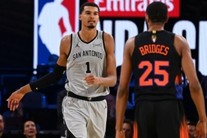 当尼克斯执着挑战文班亚马时,马刺能够应付得当:米罗今天挑战文班亚马,仿佛当年肯扬马丁挑战邓肯。护筐,换防,对付尼克斯的箭头,马刺很好。