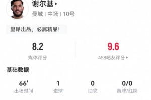 谢尔基本场3射2正进1球 1关键传球+9对抗4成功 8.2分全场最高