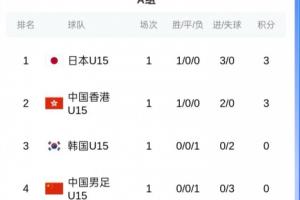 U15东亚杯积分榜:U15国足小组垫底 周六15:00将战同样失利的韩国