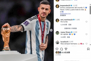 体育资讯12月18日讯 三年前的今天阿根廷在世界杯决赛击败法国夺得冠军,阿根廷球员帕雷德斯在个人社媒晒出三年前在颁奖台与冠军奖杯的合照。