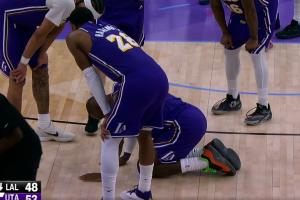 轻伤不下火线!詹姆斯被克莱顿凶狠冲撞受伤跪地 缓一下继续比赛