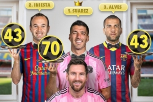 给梅西助攻最多球员:苏神70次第1,伊涅斯塔和阿尔维斯各43次第2