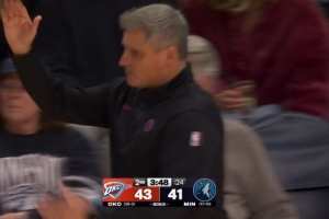 好球!亚历山大突破被海兰德切球&裁判吹后者犯规 森林狼挑战成功