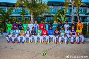 在非洲杯大合影中,刚果(金)国家队球员身穿各自俱乐部球衣出镜