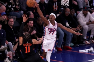 本场比赛,76人探花秀埃奇库姆发挥出色,防守端各种缠绕布伦森,令对手22中7;进攻端关键时刻中投、三分、补扣连续刷屏,助队锁定胜局。