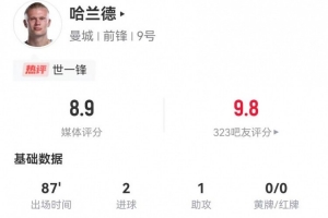 哈兰德本场7射3正进2球+2失良机 1助攻+1关键传球 获评8.9分