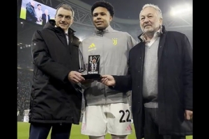 对阵罗马赛前,尤文为麦肯尼颁发200场纪念奖杯