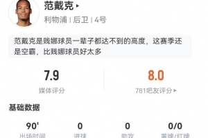 范戴克本场1造红牌6解围+12对抗10成功 9长传7成功 7.9分全场最高