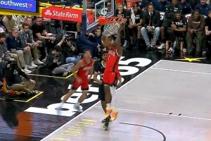 机警!谢泼德抢断反击前场稳住 篮下击地助攻阿门轻松扣篮!
