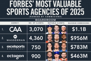 福布斯公布经纪公司2025佣金排名!CAA11亿刀第一 Klutch第五
