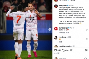 凯恩社媒:达成个人德甲参与100球里程碑,2026我们再接再厉