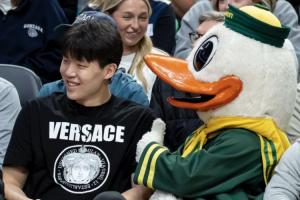 中国力量~开拓者官方晒照:杨瀚森现场支持林葳和俄勒冈