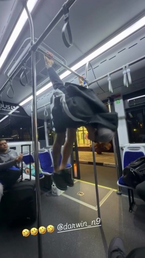 露一手!努涅斯在车上玩单杠后翻,队友发出魔性笑声