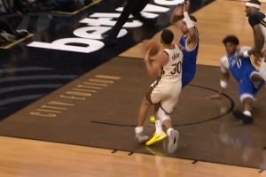 前一回合崴脚不受影响!库里底角接球顶着布莱克强投三分还中!