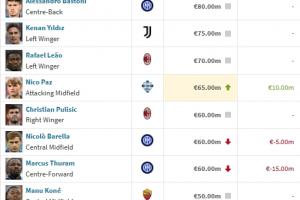 德转意甲身价更新:劳塔罗最高8500万欧不变,帕斯涨至6500万欧