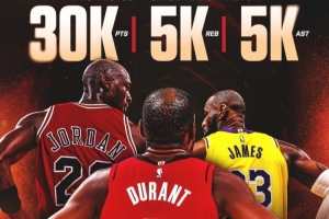 火箭晒杜兰特里程碑海报!历史第三快3W分5000板5000助球员!