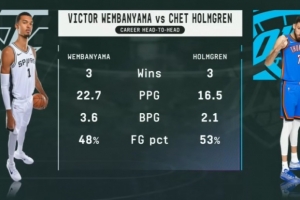 文班和霍姆格伦生涯至今交手6次战绩3-3 文班场均22.7分3.6帽!