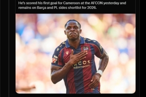 罗马诺在圣诞节发了多条转会新闻,其中有一条,他报道称巴萨和英超俱乐部都在关注喀麦隆国脚艾永。