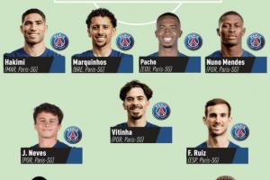 差点巴黎全队队报2025年法甲年度11人:格林伍德+巴黎10人
