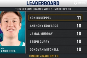已11次单场至少命中5记三分!克尼佩尔单场5+记三分场次领跑NBA