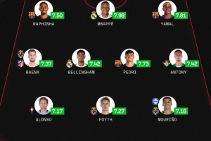 Sofascore西甲年度最佳阵:姆巴佩、亚马尔、贝林、安东尼在列