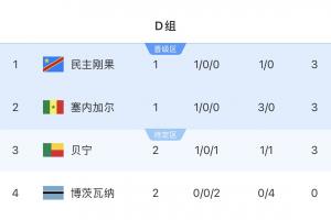 非洲杯D组积分榜:三队同积3分!贝宁取首胜 博茨瓦纳两轮丢4球