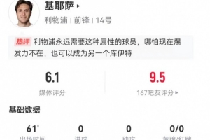 本赛季首次英超首发!基耶萨0射0关键传球+4对抗1成功 获6.1分