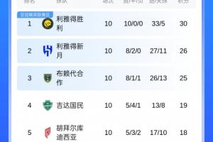 10轮轰33球!沙特联积分榜:利雅得胜利开季联赛10战全胜 4分领跑